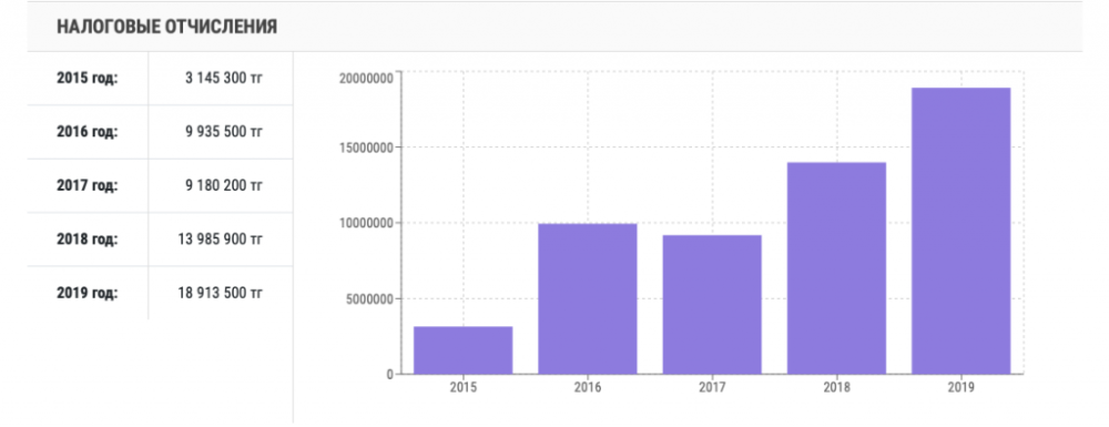 Общая сумма налоговых отчислений за четыре года составила всего 3 366 600 тенге.