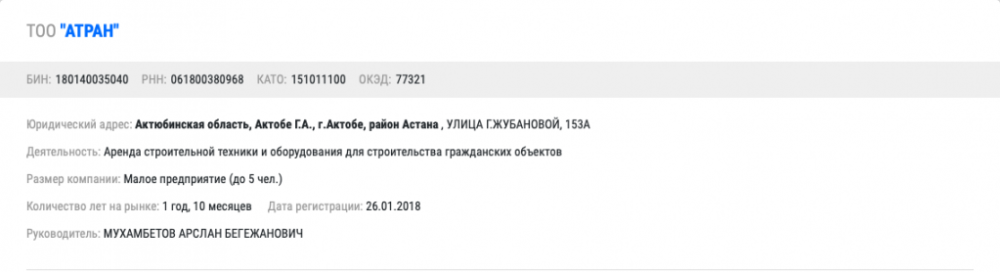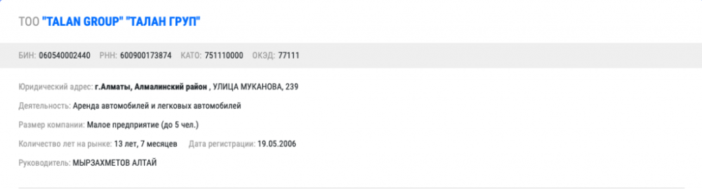 "TALAN GROUP" зарегистрировано в Алматы как малое предприятие по аренде автомобилей еще в 2006 году. По данным фискалов, налоговые отчисления не проводились с 2014 года.