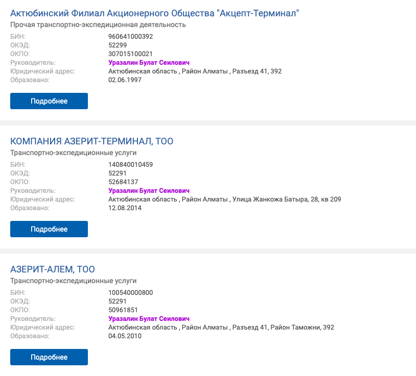 Уразалин Булат Сеилович возглавляет три компании: ТОО "Азерит-Алем", Актюбинский филиал АО "Акцепт-Терминал" и ТОО "Компания "Азерит-Терминал". Все три предприятия в сфере логистики зарегистрированы в Актобе.