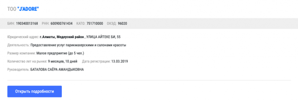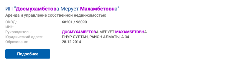 На дочери акима Атырауской области имеется ИП по аренде и управлению собственной недвижимостью в Нур-Султане.