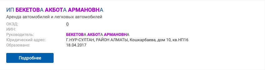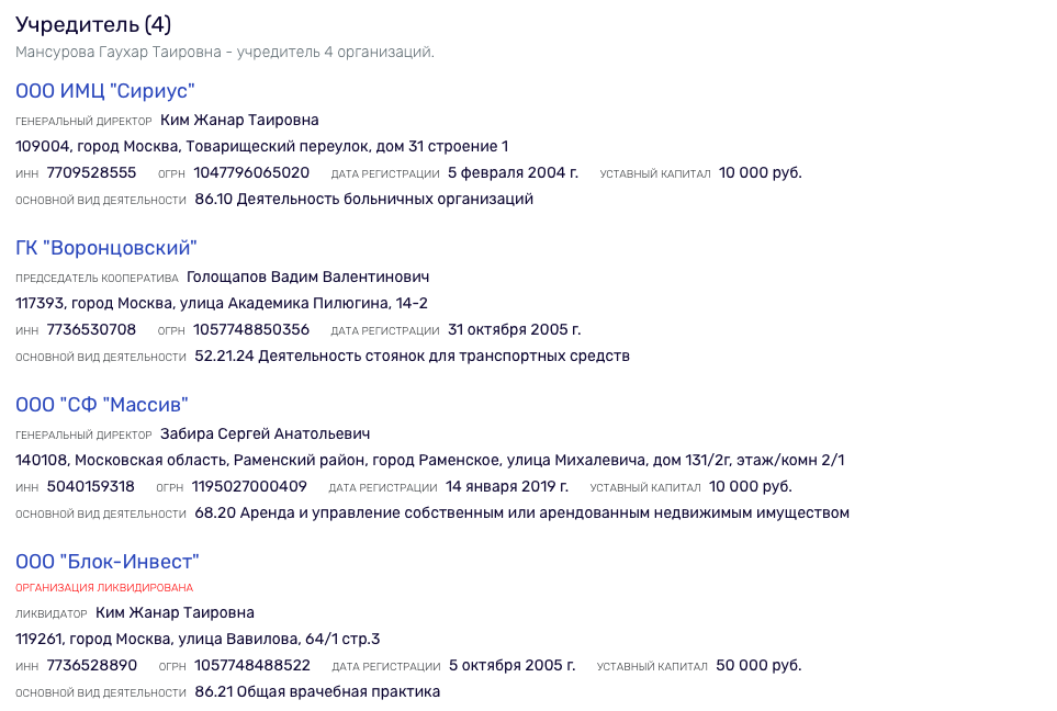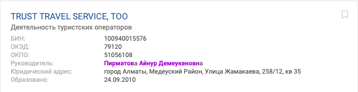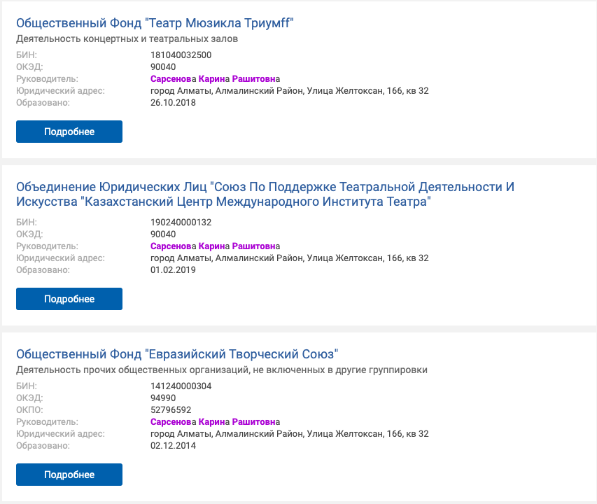 Также ее имя фигурирует в качестве руководителя нескольких общественных объединений в Алматы.
