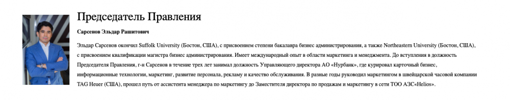 Ранее мажоритарным акционером банка была его старшая сестра – Софья Сарсенова, которой принадлежало 82,7 процента финансового института через ТОО "JP Finance Group". 74-летняя Сарсенова Софья Темирбулатовна также числится в списке Forbes. Кроме доли "Нурбанка" она владеет сетью автозаправочных станций ТОО "Гелиос". Еще пять лет назад ежегодно растущее многомиллионное состояние пенсионерки превышало 193 000 000 долларов.