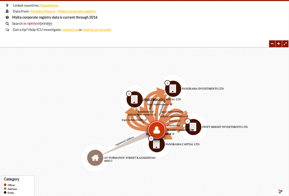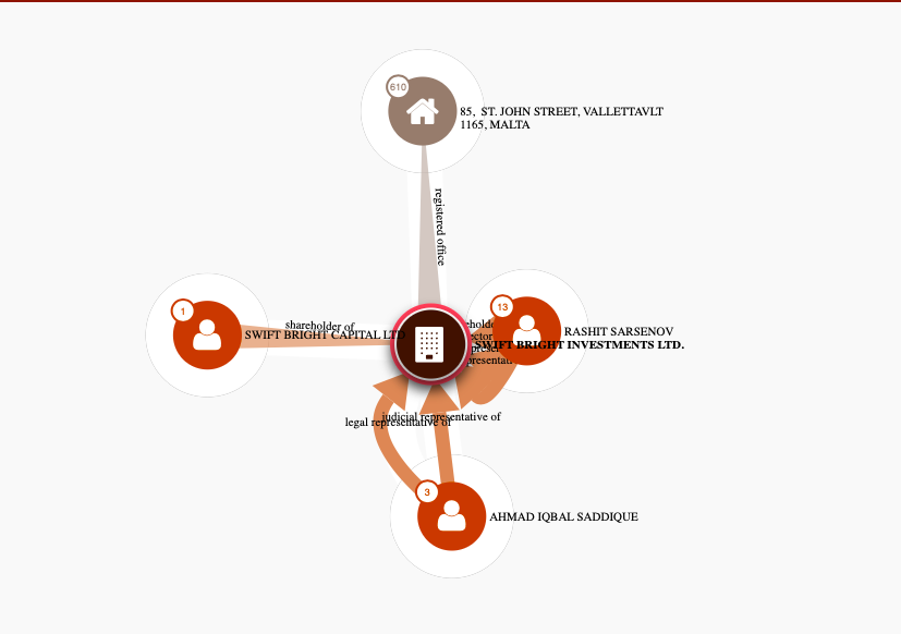 В "Panorama Capital Ltd", "Panorama Investments Ltd", "Swift Bright Capital Ltd" и "Swift Bright Investments Ltd" Рашит Сарсенов числится акционером, законным представителем, судебным представителем и директором.