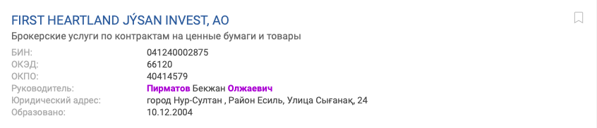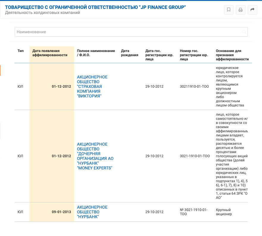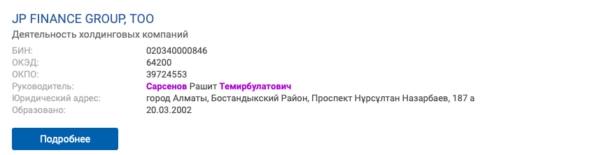 Также Рашит Сарсенов контролирует деятельность холдинговых компаний через ТОО "JP Finance Group".