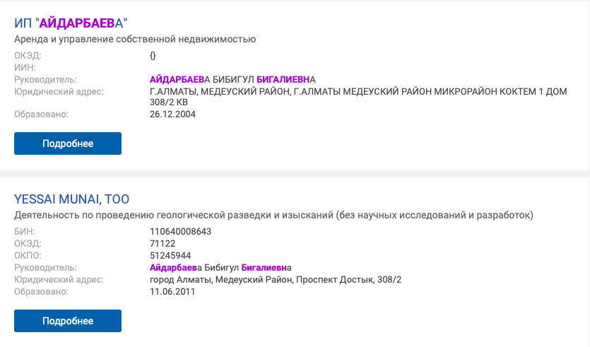 Жена главы "КазМунайГаза" руководит ИП по управлению собственной недвижимостью в Алматы. Также в ее ведении находится нефтяная компания, которая занимается геологической разведкой.