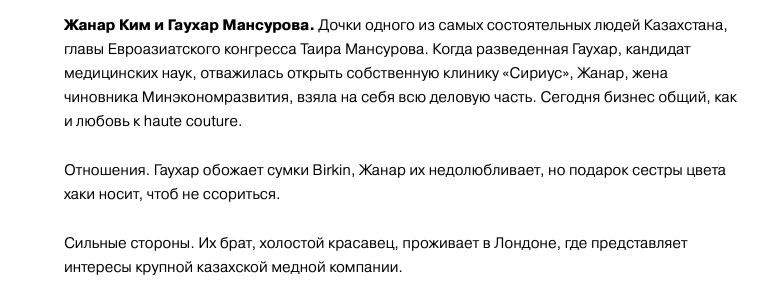 Скорее всего, лишь маленькая верхушка айсберга всех активов казахстанских магнатов и их семей представлена в открытом доступе, и большая часть капитала владельцев добывающих компаний, как и жизнь их родных, тщательно скрыта от посторонних глаз.