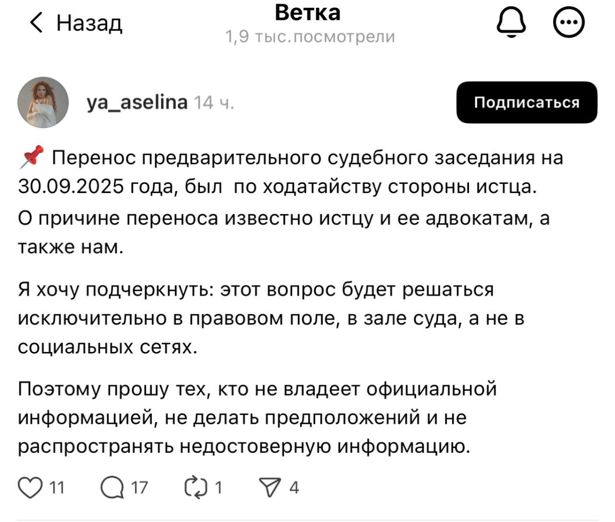 Как уточнили в пресс-службе, рассмотрение дела 19 сентября не состоялось. Одна из сторон заявила ходатайство об отложении, в связи с чем суд определил новую дату проведения предварительного слушания.