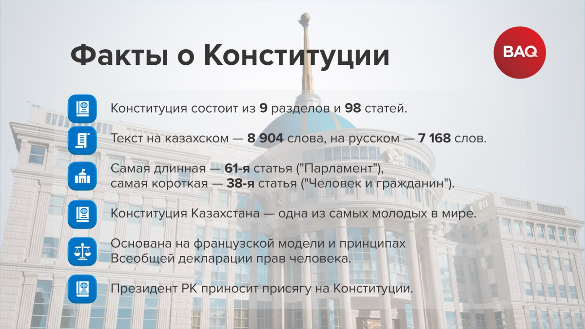 В честь праздника редакция BAQ.KZ собрала ключевые статьи Конституции, актуальные сегодня.