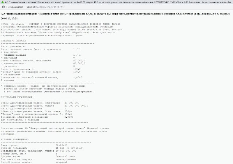 В частности, в посте "Ограбление по казахски или куда уходит пенсия?", экономист сообщил о том, что нацкомпания "Қазақстан темір жолы" привлекло на KASE 40 млрд тенге, разместив пятнадцатилетние облигации KZ2C00005866 (TMJLb6) под 2,00 % годовых", заметив, что сделка получилась явно "нерыночная", особенно с учетом того, что в этих торгах принимал участие только один участник.