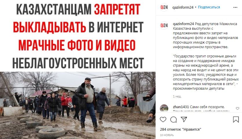 Публикация о том, что депутаты предлагают запретить казахстанцам публиковать фото и видео, порочащие имидж страны, появилась в сатирическом Instagram-аккаунте Qazinform24.