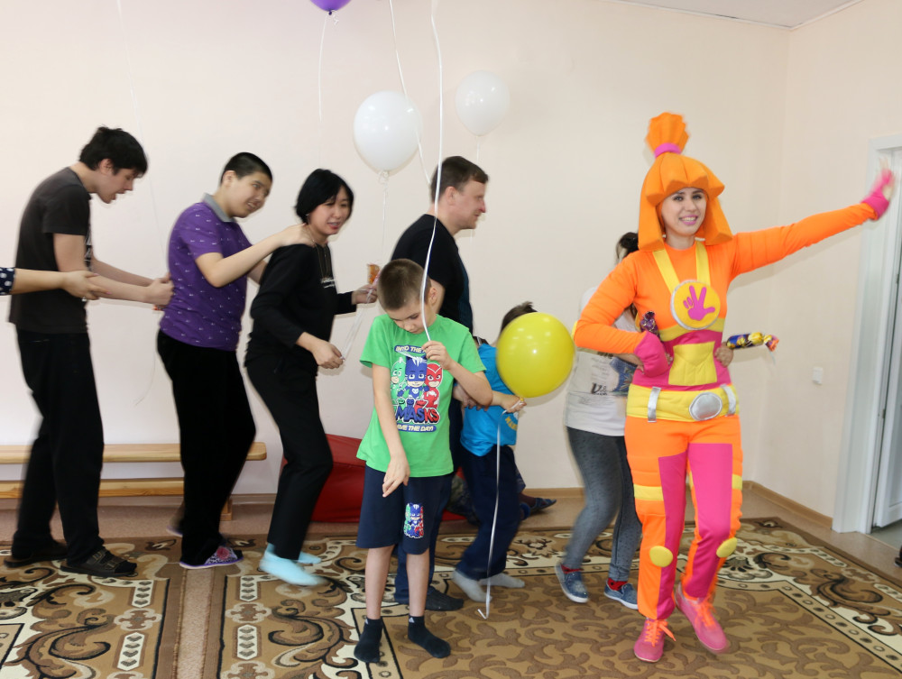 А представители профсоюзного центра области, а также организации, объединяющей работников культуры, спорта, туризма и СМИ, навестили детей в реабилитационном центре и устроили для них настоящий праздник с шарами, фруктами и настоящими героями из мультфильмов.