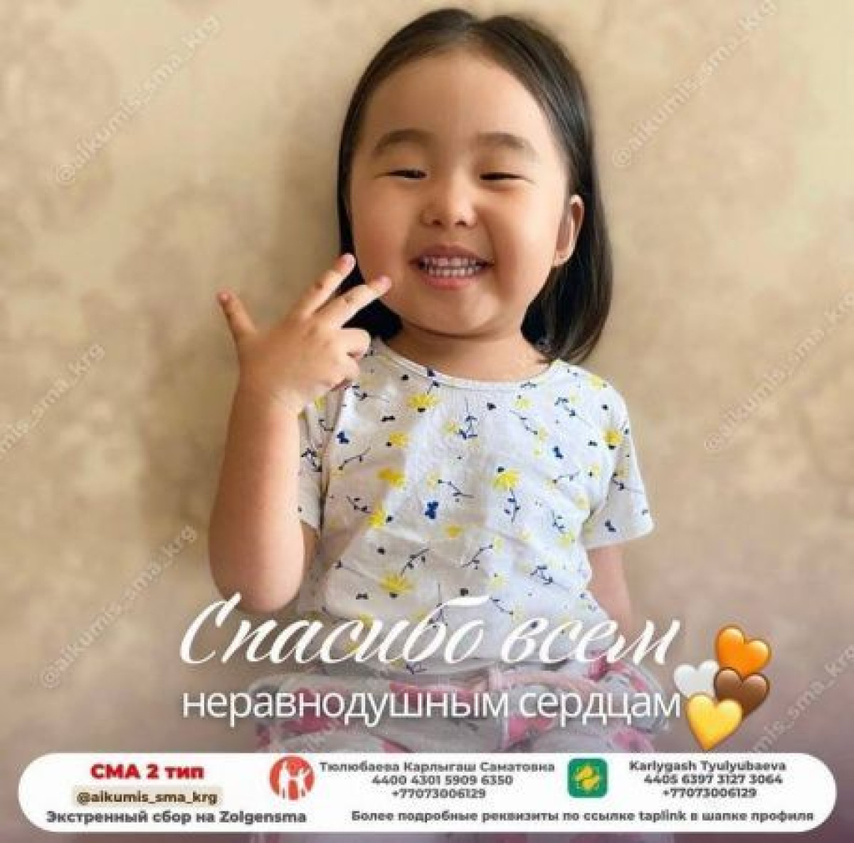 "Мы обращались в фонд. Но они помогли только детям до двух лет. По мировому стандарту этот укол рекомендуют детям до двух лет или же с весом не превышающим 13,5 килограмма. Но экспертно-консультативный совет на вес не смотрит, смотрят только на возраст. И фонд помог только детям до двух лет. Но медицина же на месте не стоит. Этот препарат уже вводят детям до 21 килограмма. У нас Айкумыс весит 13 килограмм, 100 грамм. Перед тем как получить этот укол, Айкумыс полностью будет обследоваться. И сдавать различные виды анализов. Есть анализ который определяет, подходит ли "Золгенсма" для организма. Мы в Америку отсюда отправляли, ей подходит. Если бы не подходило, мы бы сбор не открывали", - сказала Карлыгаш Тюлюбаева.