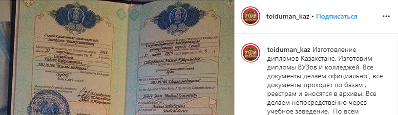 В частности, в аккаунте toiduman_kaz опубликован пост, в котором предлагается заинтересованным лицам сделать диплом на заказ.
