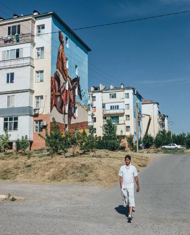 В своих артах Дмитрий использует и национальный колорит, к примеру, на одном из фасадов домов появился кобыз, находящийся в космическом пространстве. Жители многоэтажки от перфоманса остались в восторге.