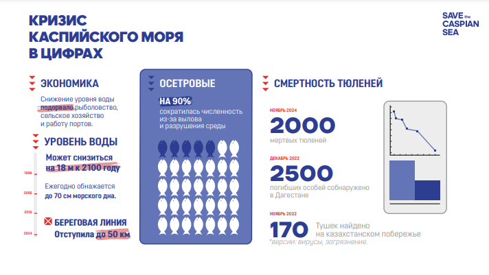 Одним из самых заметных свидетельств кризиса стала массовая гибель редких каспийских тюленей: лишь только за последние два года на разных берегах Каспия было обнаружено около четырёх тысяч туш, что является тревожным сигналом надвигающейся экологической катастрофы.