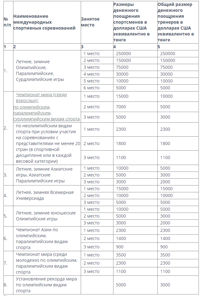 Летние, зимние Олимпийские, Паралимпийские, Сурдлимпийские игры: за первое место 250 тысяч долларов, за второе место – 150 тысяч долларов, за третье место - 75 тысяч долларов. Предусмотрены премии также за 4, 5, 6 место: 30 тысяч, 10 тысяч, пять тысяч долларов.