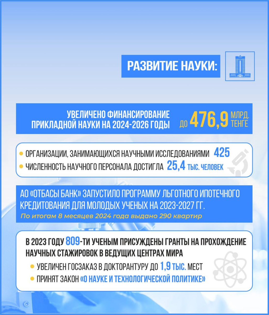 Особое внимание уделяется созданию условий в подготовке научных кадров (докторов PhD), увеличен госзаказ в докторантуру до 1,9 тыс. мест.