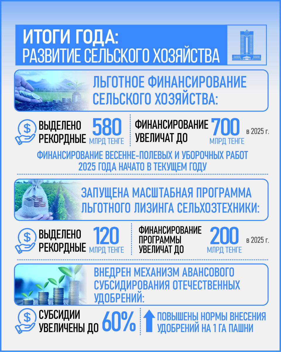 В текущем году были созданы все необходимые условия для успешного проведения весенне-полевых и уборочных работ. Во исполнение поручений Главы государства обеспечивается доступность финансирования АПК. Объем льготного финансирования отрасли впервые составил рекордные 580 млрд тенге, которые были направлены аграриям на прямое кредитование, удешевление процентной ставки и форвардный закуп. В 2025 году сумма достигнет 700 млрд тенге. Благоприятные погодные условия осени позволили провести уборочную кампанию практически без значительных потерь, несмотря на осадки во время сбора урожая.