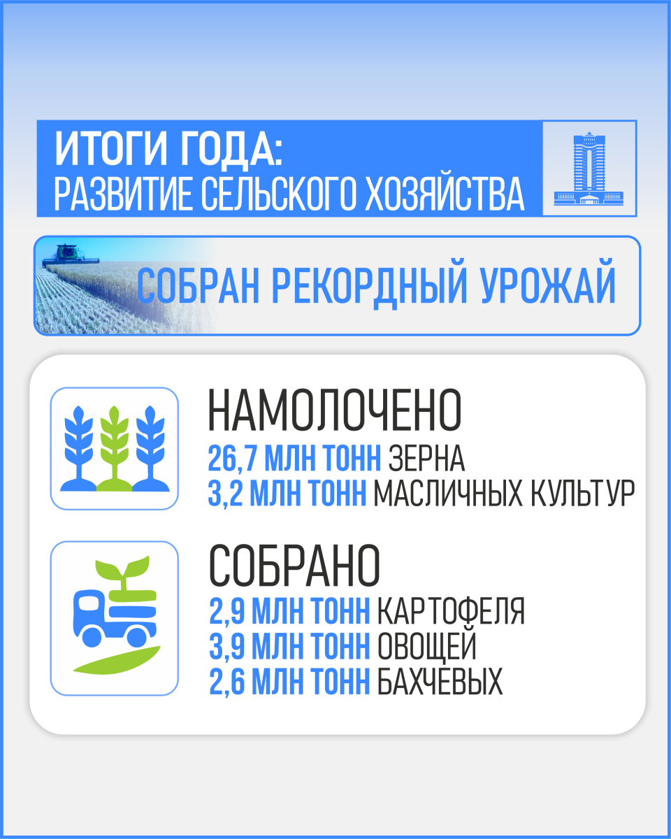 Как результат, аграриями республики был собран рекордный урожай зерновых культур — при средней урожайности 16,1 ц/га намолочено 26,7 млн тонн зерна. Для сравнения в 2023 году средняя урожайность составила 10 ц/га. Также намолочено 3,2 млн тонн масличных культур с урожайностью 10,9 ц/га, собрано 2,9 млн тонн картофеля, 3,9 млн тонн овощей и 2,6 млн тонн бахчевых. Высокая урожайность была достигнута, в том числе, благодаря правильному применению агротехнологий, качественным семенам, минеральным удобрениям и эффективной защите растений.
