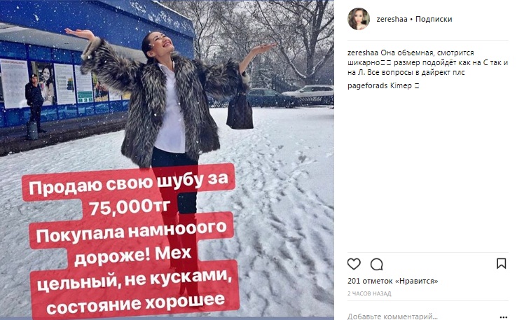 Дочь бизнесмена Муратхана Токмади Зере Шакерхан на своей личной страничке в Instagram начала продавать шубу, передает корреспондент BNews.kz.