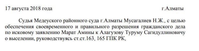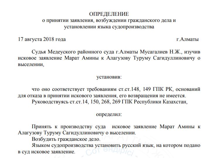 "Судья Медеуского районного суда Алматы Мусагалиев Н.Ж., изучив исковое заявление Марат Амины к Алагузову Туруму Сагидуллиновичу о выселении, установив, что оно соответствует требованиям статей 148, 149 ГПК РК, оснований для отказа в принятии искового заявления, его возвращения не имеется", - говорится документе определения.