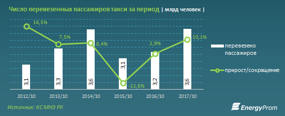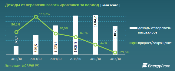 В частности, доходы от перевозки такси пассажиров за 10 месяцев 2017 года составили 1,2 млрд тенге, впервые сократившись с 2012 года. По сравнению с суммой, заработанной за аналогичный период прошлого года, доходы уменьшились на 29,6%, или на 498,7 млн тенге.