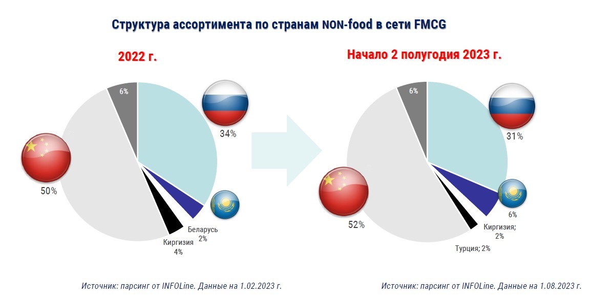 Доля российских непродовольственных товаров на полках казахстанских магазинов сокращается и составляет в 2023 году 31%. При этом доля непродовольственных товаров из Китая за год выросла и составила 52%.