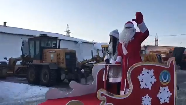 Дед Мороз и Снегурочка колесят по автопарку на тракторе для чистки снега. Необычная идея пришла в головы работникам предприятия «Благоустройство города Караганды» - они украсили гирляндами технику, соорудили сани для новогодних персонажей, по специальным лекалам вырезали детали из фанеры.