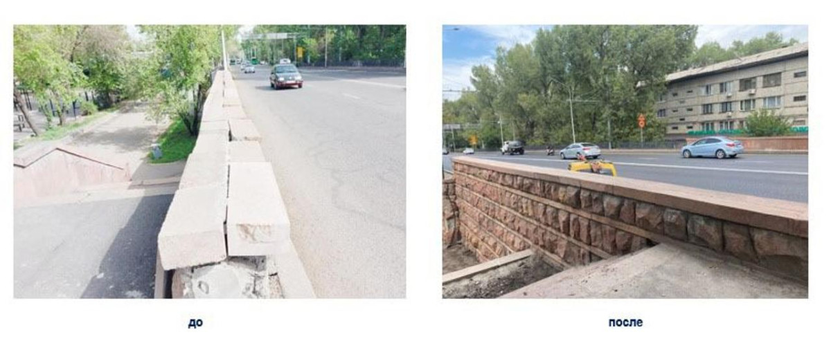 Следует отметить, что одна из подпорных стен со стороны проспекта Сейфуллина нуждается в замене практически половины плит, которые опали за время многолетней эксплуатации моста. При этом гранитные плиты, использованные при строительстве в облицовке моста, в настоящее время уже не производят. Так, замена плит на аналогичные из гранитного материала в рамках одной стены будет влиять на конечный внешний вид. В этой связи в целях сохранения исторического облика акимом Турксибского района Бахытжаном Акжаровым предложено заменить на наиболее пострадавшей стене все плиты на современные высококачественные аналоги, а изъятые плиты использовать для восполнения пробелов на других менее поврежденных участках. Оставшаяся после завершения реконструкции часть материала будет сохранена для последующего применения по мере необходимости в случае новых повреждений.