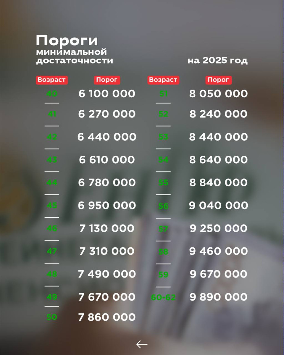 В Едином накопительном пенсионном фонде (ЕНПФ) сообщили, какие пороги минимальной достаточности (ПМД) станут действовать в 2025-м гоу для использования пенсионных накоплений, передаёт BaigeNews.kz со ссылкой на информацию фонда.