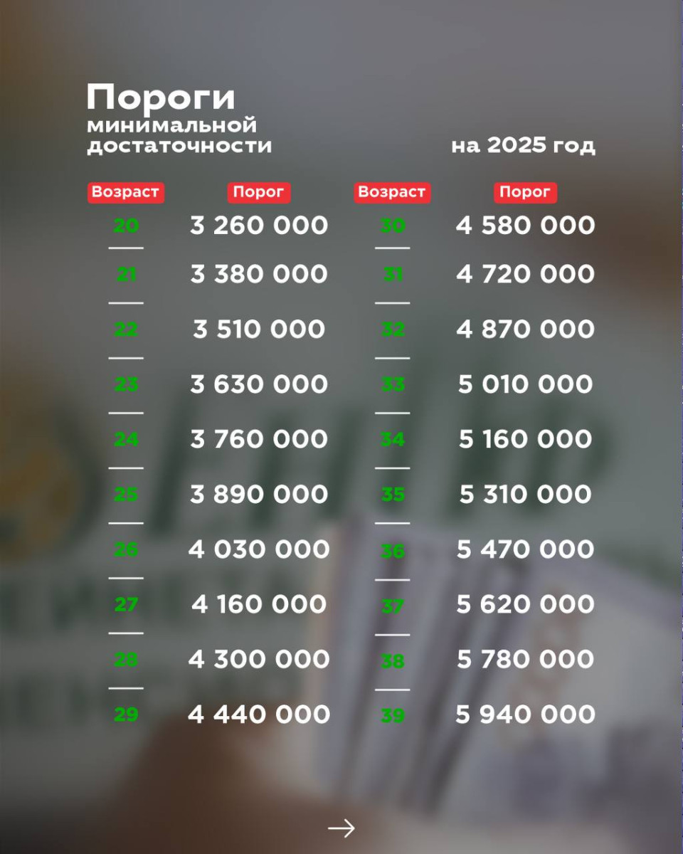 Данные значения вступят в силу с 1-го января следующего года. Суммы варьируются примерно от трёх до 10 млн тенге (в зависимости от возраста).