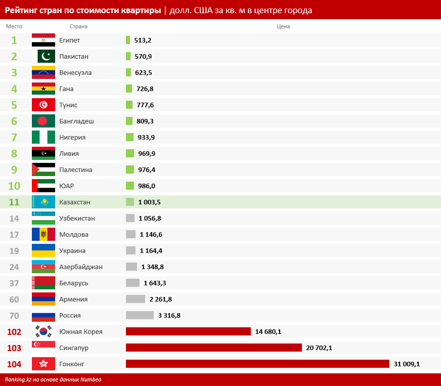 При этом сама жилая недвижимость в РК остаётся в весьма доступном ценовом диапазоне. Так, в рейтинге стран по стоимости квартиры в центре города Казахстан занял 11-е место среди 104 стран с показателем одна тысяча долларов США за квадратный метр.