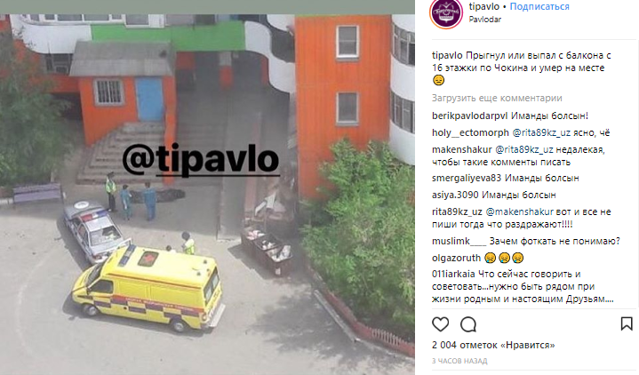 "Погибшим оказался парень 1987 года рождения. Вызов поступил по улице Кутузова, 52. Скорую помощь вызвали очевидцы. Мужчина получил травмы не совместимые с жизнью. Характер повреждений соответствует травмам, полученным в результате падения с очень большой высоты", - прокомментировала пресс-екретарь управления здравоохаранения Павлодарской области Эльмира Темиргалиева.