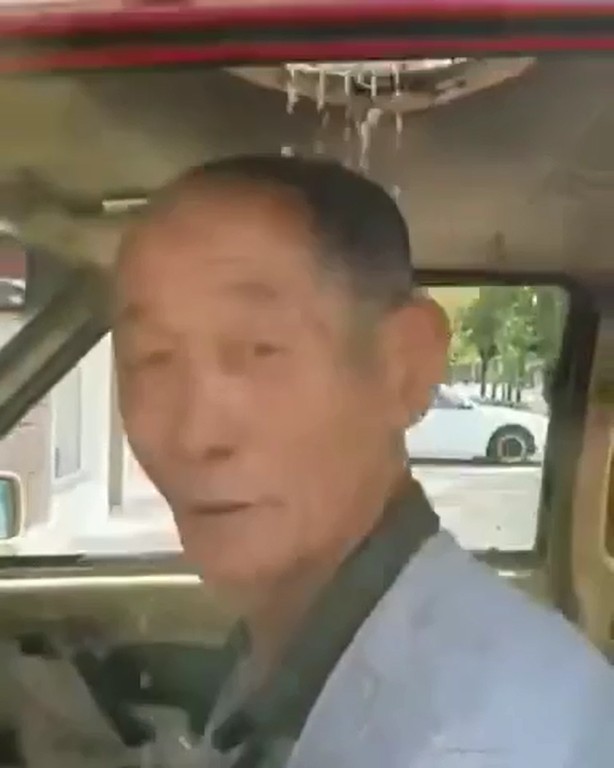 Дедушка, очевидно, является весьма смекалистым человеком, не лишенным чувства юмора. Для своего "железного друга" он смастерил не только душ с настоящим баком, прикрепленным на крыше автомобиля, но и приспособил для обеспечения "прохладного ветерка" обычный комнатный вентилятор вместо кондиционера.
