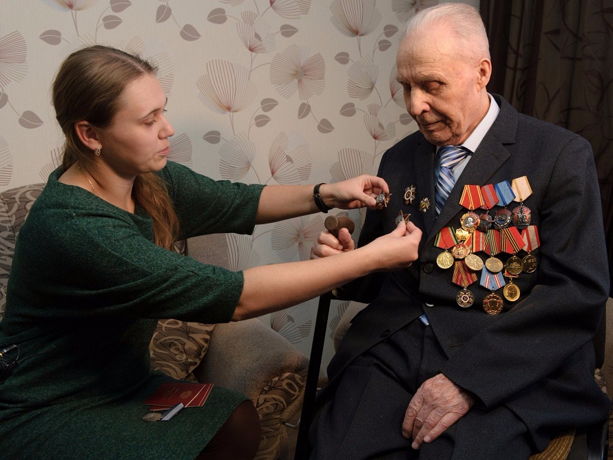 <p>Награды вручала атташе посольства РФ в Казахстане София Гайсина. Вместе с ней в квартиру ветерана Великой Отечественной войны Владимира Титкова пришли чиновники, бывшие односельчане и коллеги. Дочь Ольга просит отца не волноваться и предупреждает его, что народу пришло много.</p>