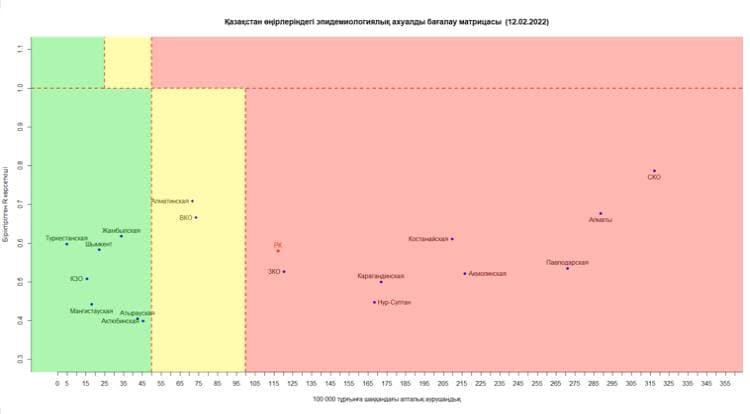 Опубликована матрица оценки эпидемиологической ситуации в регионах Казахстана на 12 февраля 2022 года, передаёт BaigeNews.kz со ссылкой на coronavirus2020.kz.