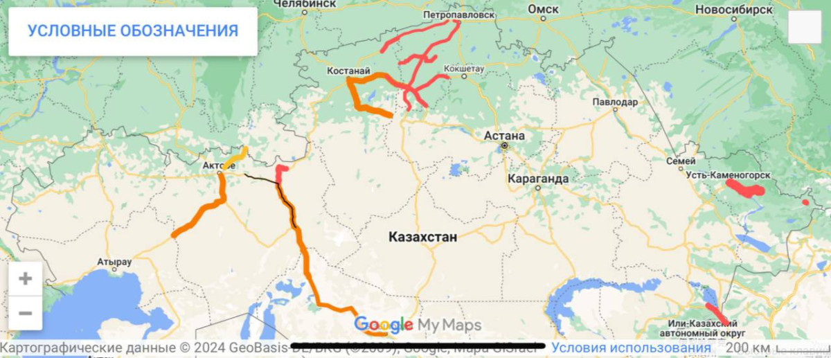 Актюбинская область – пять участков (933 километра), Атырауская область – участок длиною 16 километров, Восточно-Казахстанская область – два участка (180 километров), Жетысуской область – участок в 100 километров, Костанайская область – пять участков (535 километров), Кызылординская область – участок в 120 километров, Северо-Казахстанская область – девять участков (1036 километров).