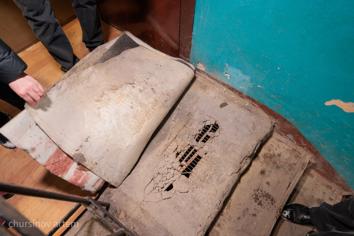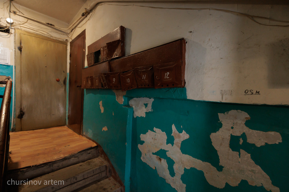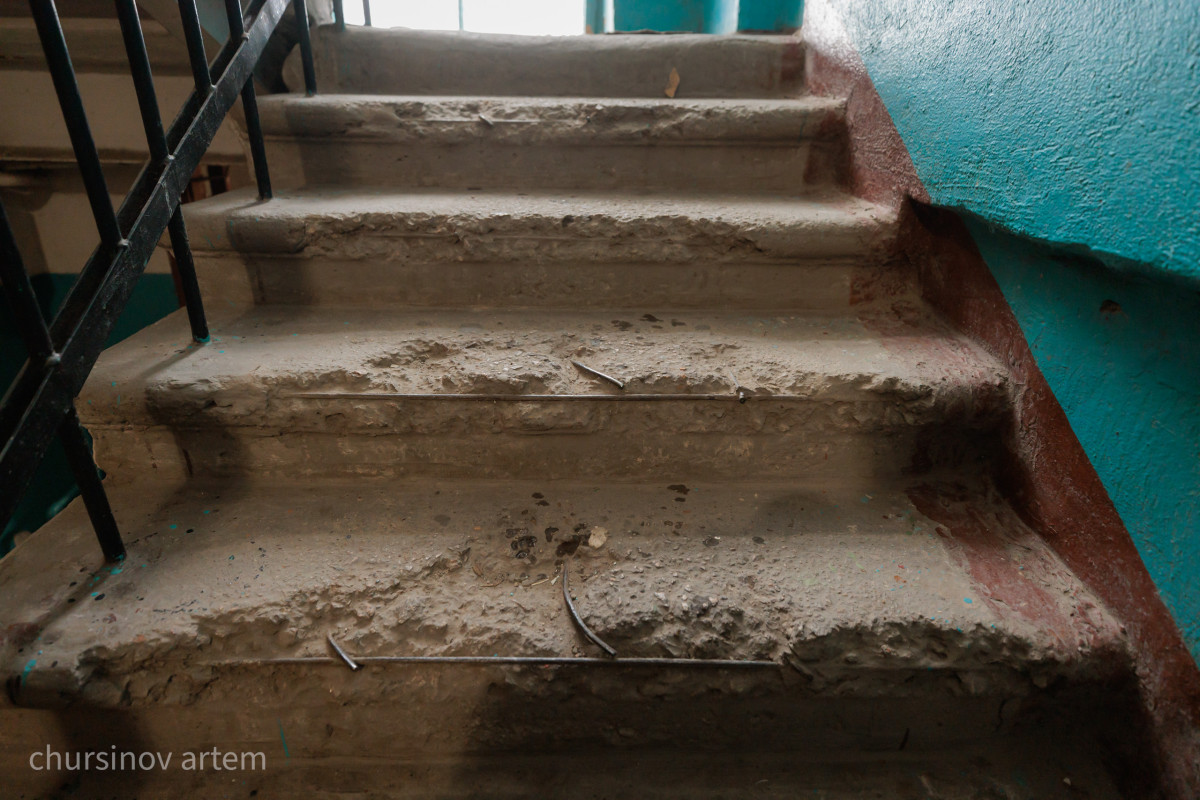 За более чем 50-летнюю историю здание сильно износилось. Снаружи, у крыши, виднеются широкие щели между плитами. Лестничные марши укрепляли дополнительными металлическими элементами, чтобы они не обвалились. Дыры прямо в подъездных плитах приходится закрывать линолеумом. Оттуда в подъезд попадают канализационные испарения.