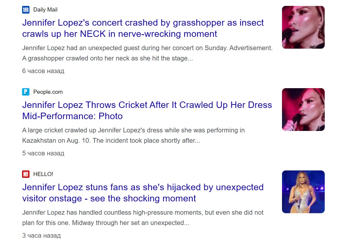 Когда камера снимала певицу крупным планом, на её обнажённую шею приземлился крупный кузнечик. Момент увидели тысячи зрителей на большом экране. Джей Ло спокойно продолжила петь, а затем эффектно сбросила насекомое, вызвав бурю аплодисментов.