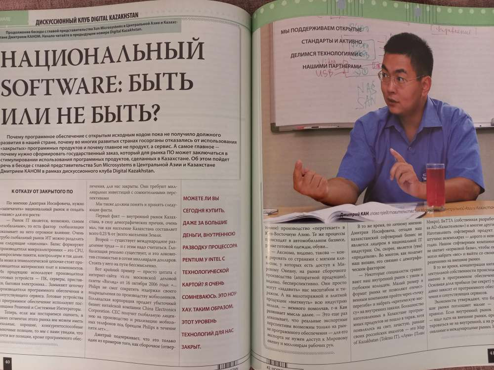 В науке всегда поощрялось, когда ученые делятся и открыто обсуждают свои находки и открытия, потому что теории, технические разработки и технологии базируются на предыдущих открытиях. Осенью 2006 года у нас (я с научным редактором и профессором Ахметом Ибраевым представлял журнал Digital Kazakhstan) и тогда 34-летним главой представительства Sun Micrоsystems в Казахстане и Центральной Азии Дмитрием Каном (ныне он директор лаборатории кибербезопасности "Engine.ER Lab", в соцсетях не активен) состоялся в Алматы обстоятельный разговор, в котором Дмитрий ставил ребром, совершенно по-гамлетовски, вопрос "быть ли не быть" всей нашей отечественной софтверной отрасли.