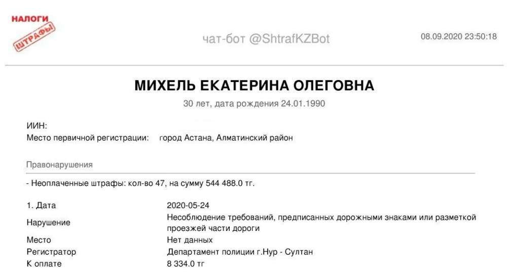 Журналист Михаил Козачков в своем Telegram-канале выложил информацию о штрафах самой одиозной участницы праймериз Нур Отан Екатерины Михель. В документе указано, что ей выписано 47 штрафов за нарушение ПДД на сумму 544 488 тенге, сообщает BaigeNews.kz.