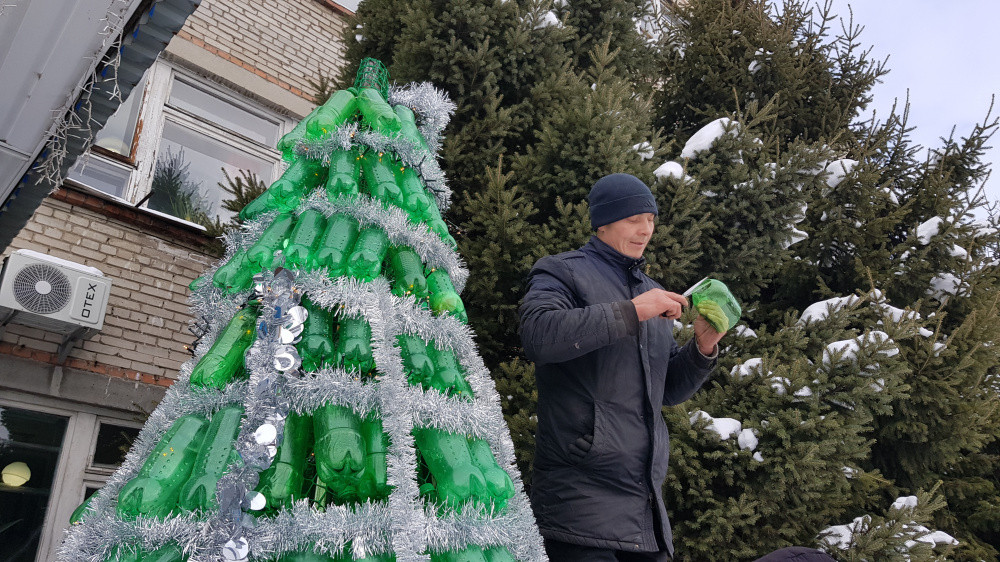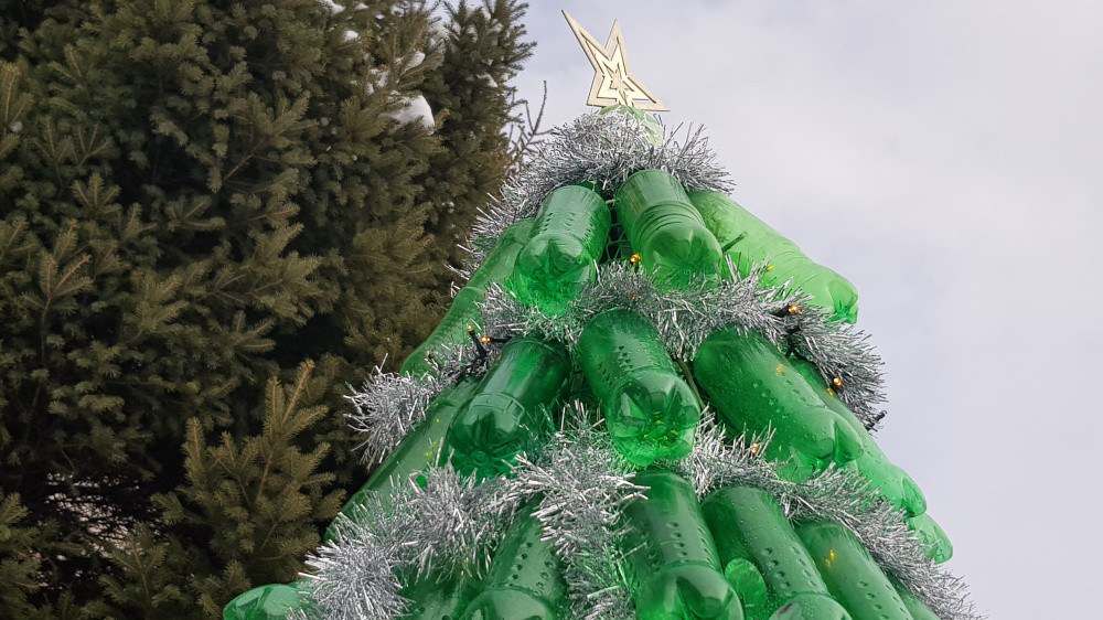 Необычная новогодняя ель появилась у здания департамента экологии Восточно-Казахстанской области. В течение нескольких часов её собирали из отработанных бутылок сотрудники ТОО, занимающегося сбором пластиковых отходов.
