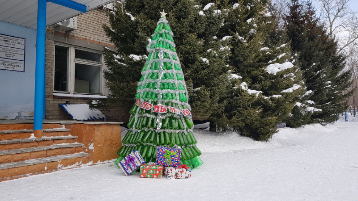 Необычная новогодняя ель появилась у здания департамента экологии Восточно-Казахстанской области. В течение нескольких часов её собирали из отработанных бутылок сотрудники ТОО, занимающегося сбором пластиковых отходов.