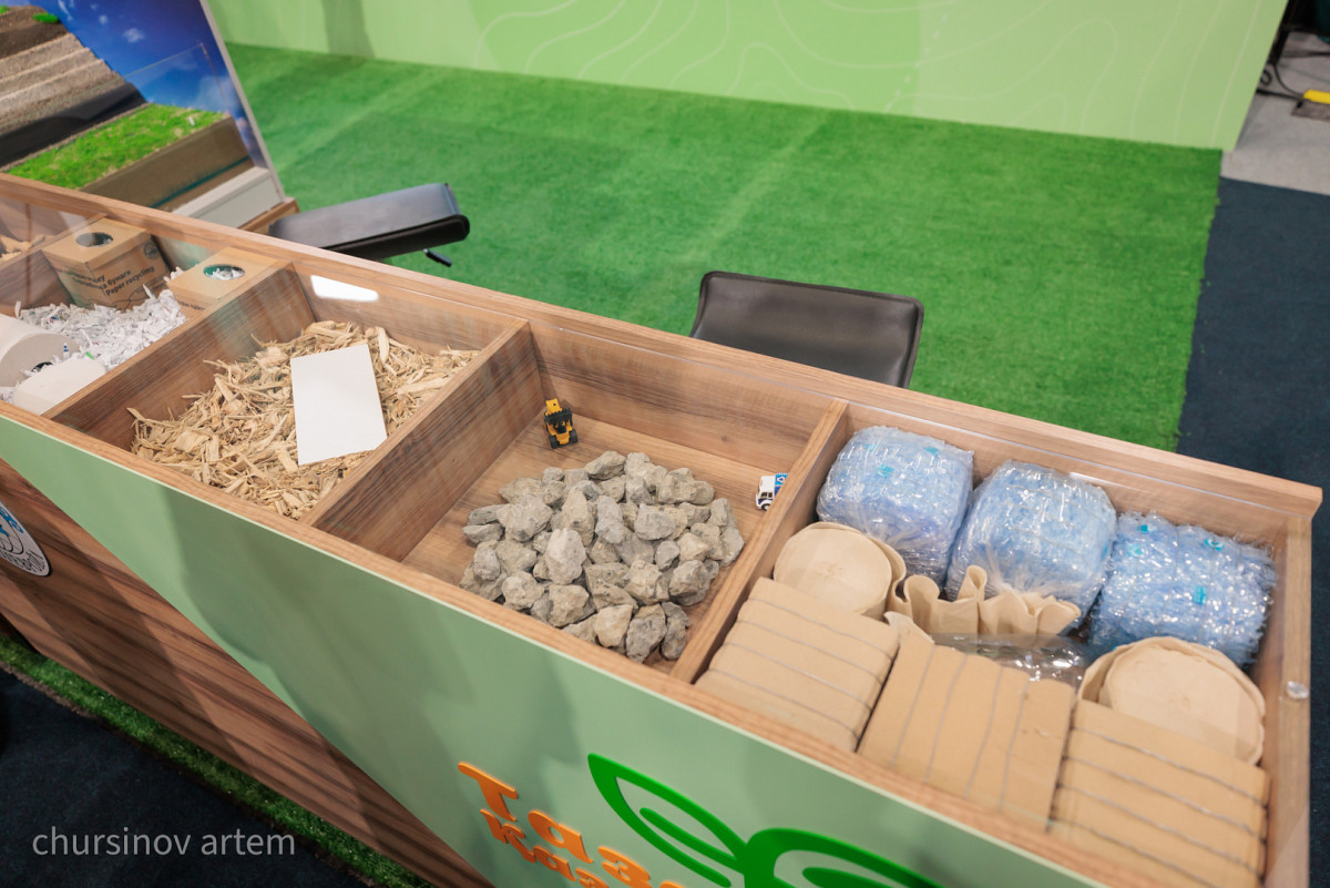 Семь выставочных зон были посвящены теме вторичной переработки. Среди них – "KazStoneBox", компания делает мебель и контейнеры для мусора из каменной бумаги. Этот материал прочный, не боится воды и полностью перерабатывается. Он может стать хорошей заменой дереву и пластику.