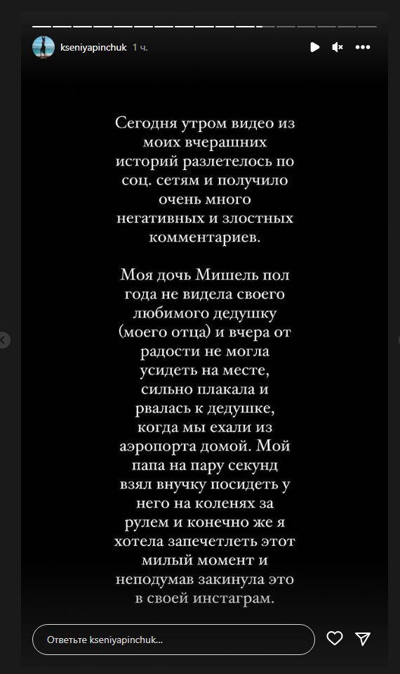 "...сильно плакала, рвалась к дедушке, когда мы ехали из аэропорта домой. Мой папа на пару секунд взял внучку посидеть у него на коленях за рулём, и, конечно же, я хотела запечатлеть этот милый момент, и, не подумав, закинула это в свой инстаграм. Мне очень грустно читать злые комментарии о том, что меня нужно лишить родительских прав. Вы серьезно? Откуда столько ненависти и злости? Разве небольшой проступок стоит таких пожеланий?" - написала она.