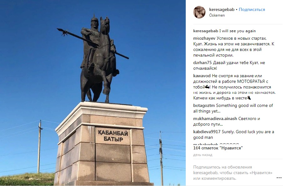 Бывший аким областного центра ВКО выложил в соцсети фотографию памятника Кабанбай батыра и подписал публикацию словами: "Мы ещё увидимся".