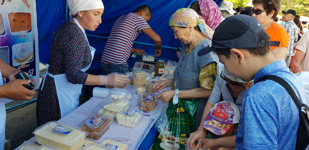 Супруги Пирымкул привезли из родного района Биржан сал всю линейку молочной продукции: молоко, масло, творог, коспа, катык, курт. Весь товар гости ярмарки разобрали буквально за пару часов.