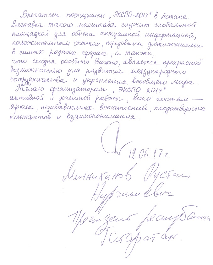 Книга записей почетных гостей EXPO 2017 – это уникальный исторический документ, свидетельствующий о глубоком интересе мировой общественности к Казахстану и его экономике.