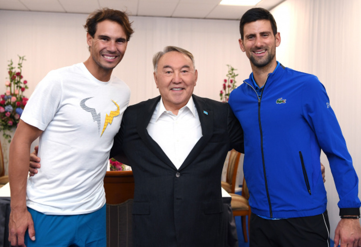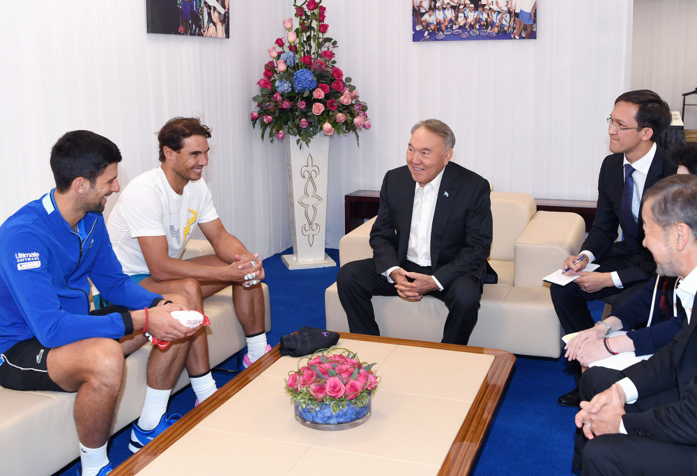 Перед началом матча Елбасы встретился с мировыми легендами тенниса Новаком Джоковичем и Рафаэлем Надалем.