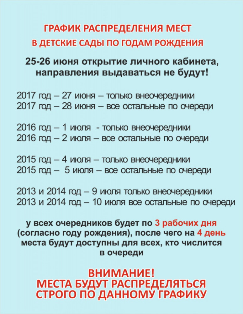 «Поэтому мы планируем, что с 27 июня будем открывать систему поэтапно для разных годов. Соответственно, 27 июня будет открыта для 2017 года рождения, потом 1 июля для 2016 года рождения, 4 июля для 2015 года рождения, и 9 июля для 2013-2014 годов рождения», - отметил Жангозин.
